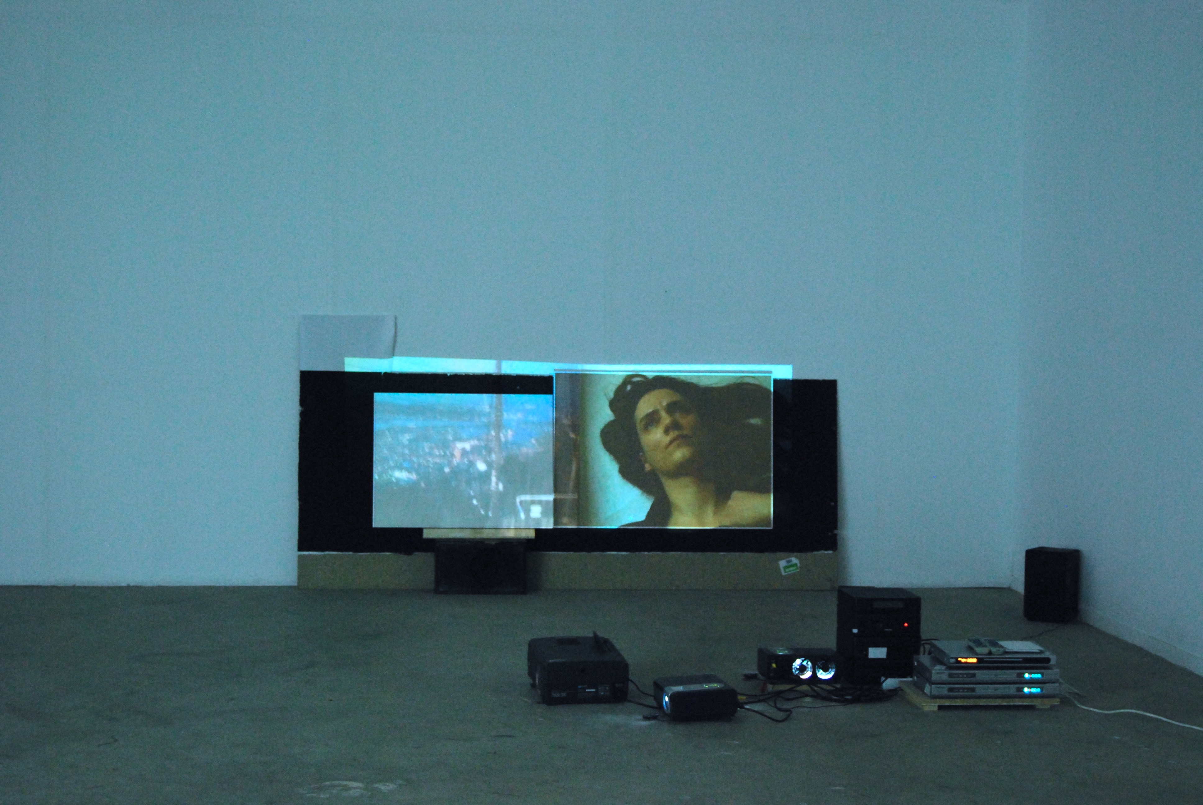 Photo 1,2,4,5: Double video projection on vintage photo frames,wood block, loudspeaker, wood and paper, 7' & 15' DVD loop, with sound;