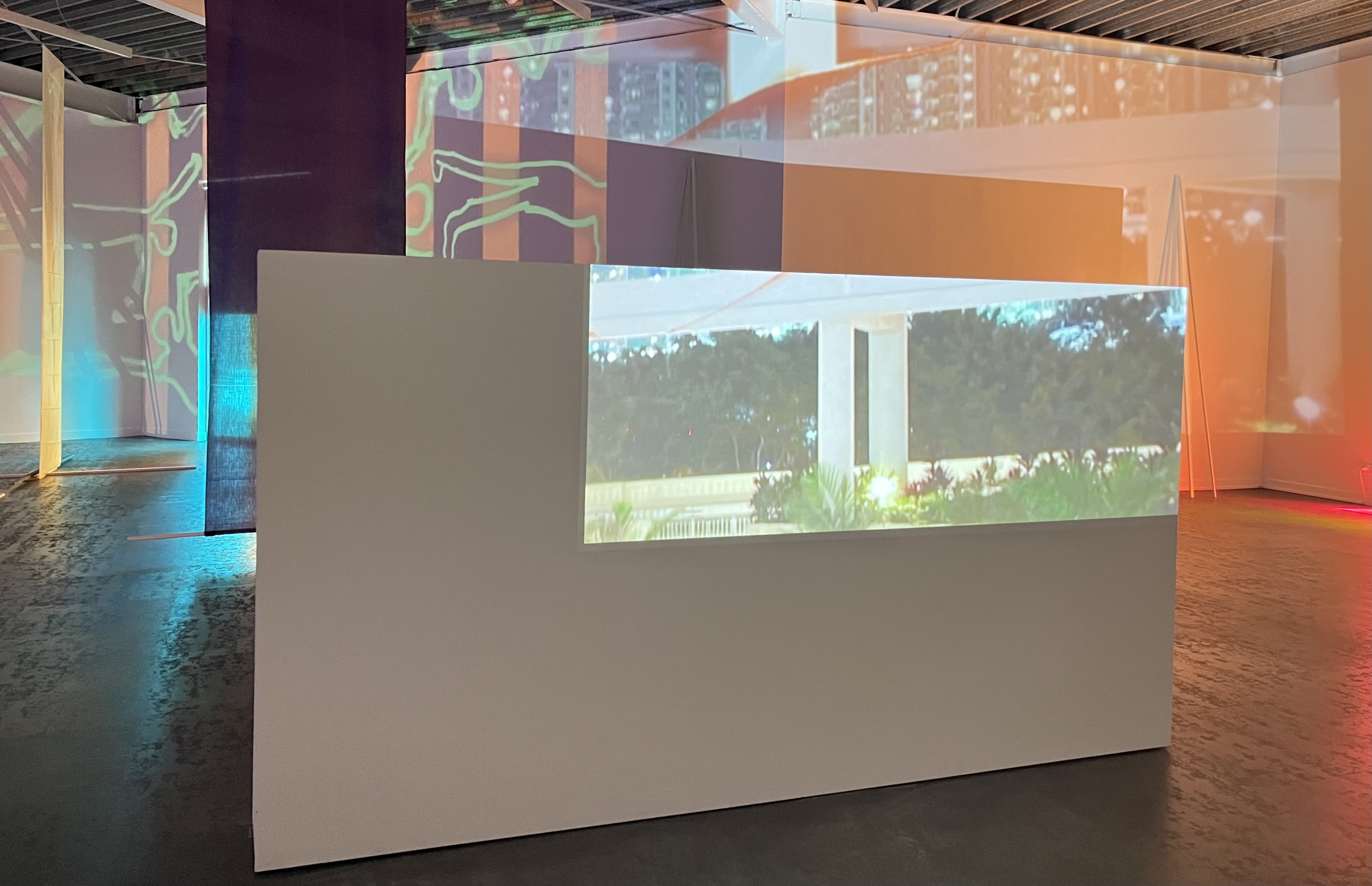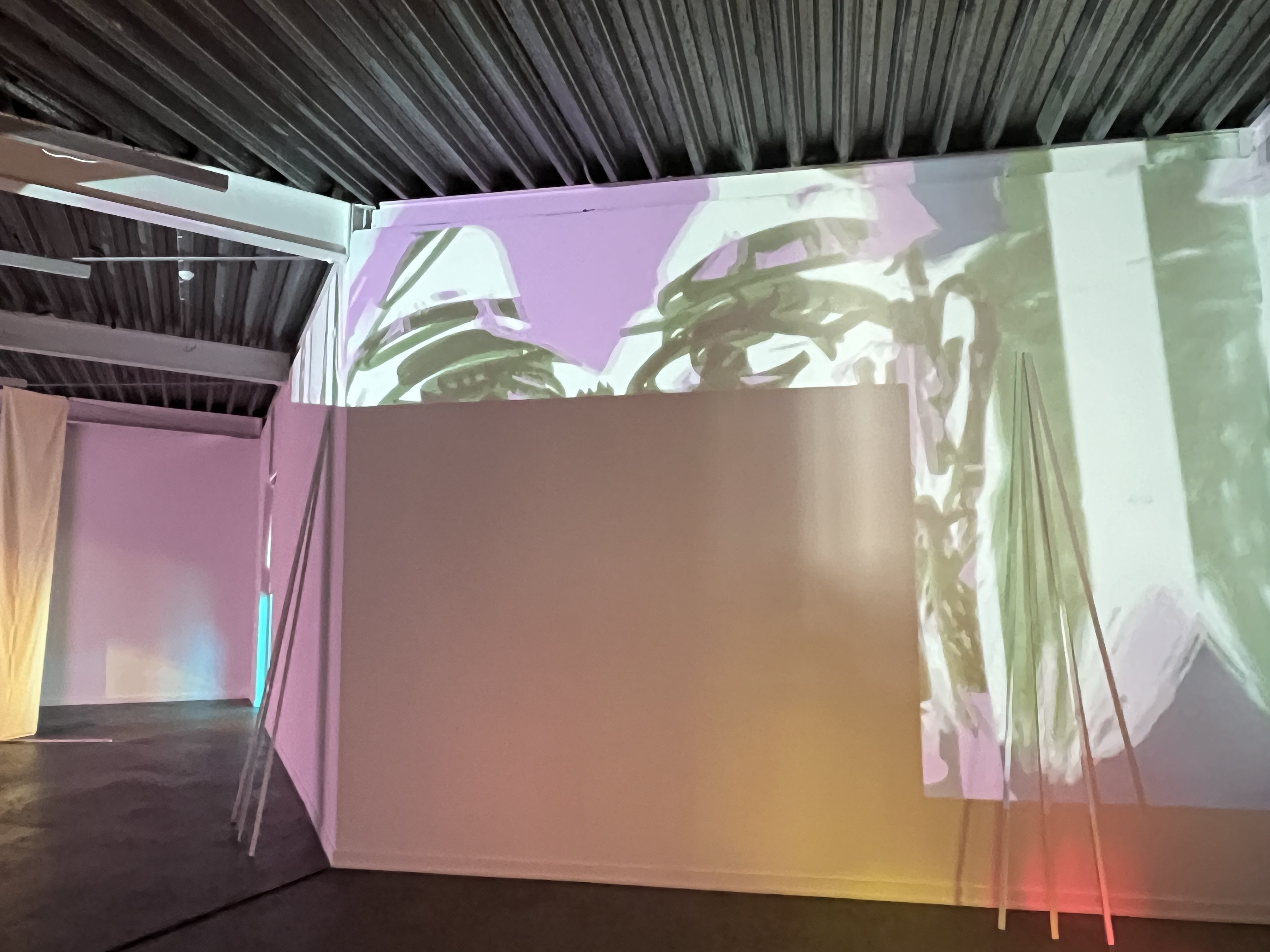 Video projections, cotton fabrics, inkjet print on fabric, PLOT prints, inkjet print on window sticker, LEE filters, wood, acrylic paint, paper clips, colored window filters, existing metal structures from the ceiling, existing window blinds