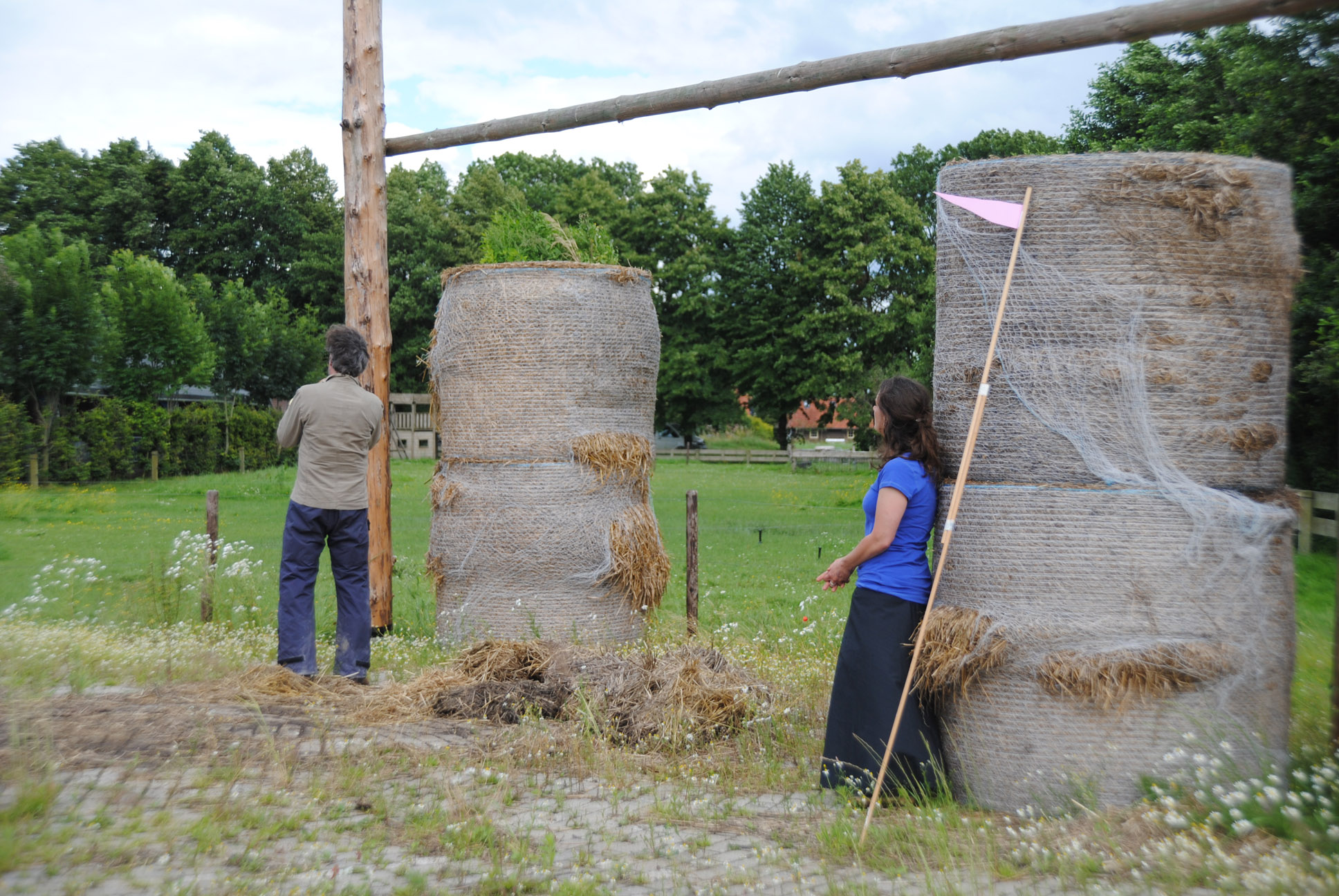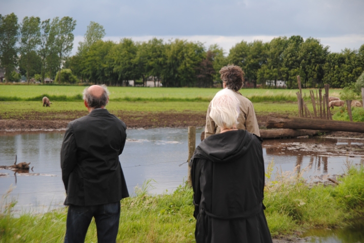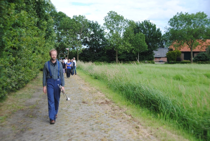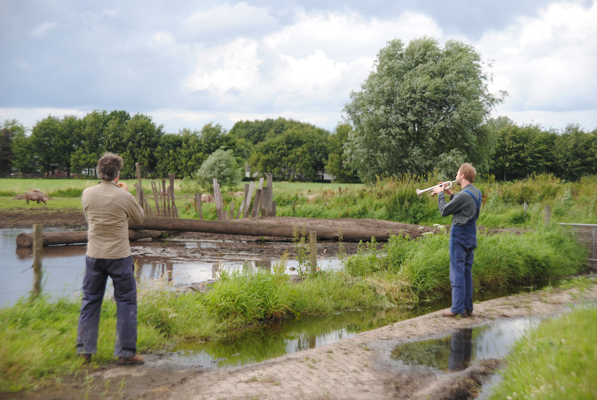 Special setting with meditative performance walk at the Jofrahoeve on the occasion of Tafelontmoeting. Idea, scenario, production and performance: Wineke Gartz. In collaboration with Jan Willem Moulijn (trumpet and performance) and Peter Huber (trumpet and performance).